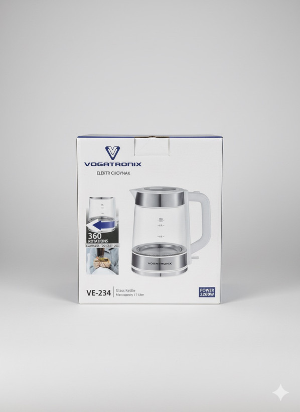 کتری برقی شیشهای VOGATRONIX مدل VE-234 | 1.7 لیتر، 2200 وات، جوش سریع و ایمن